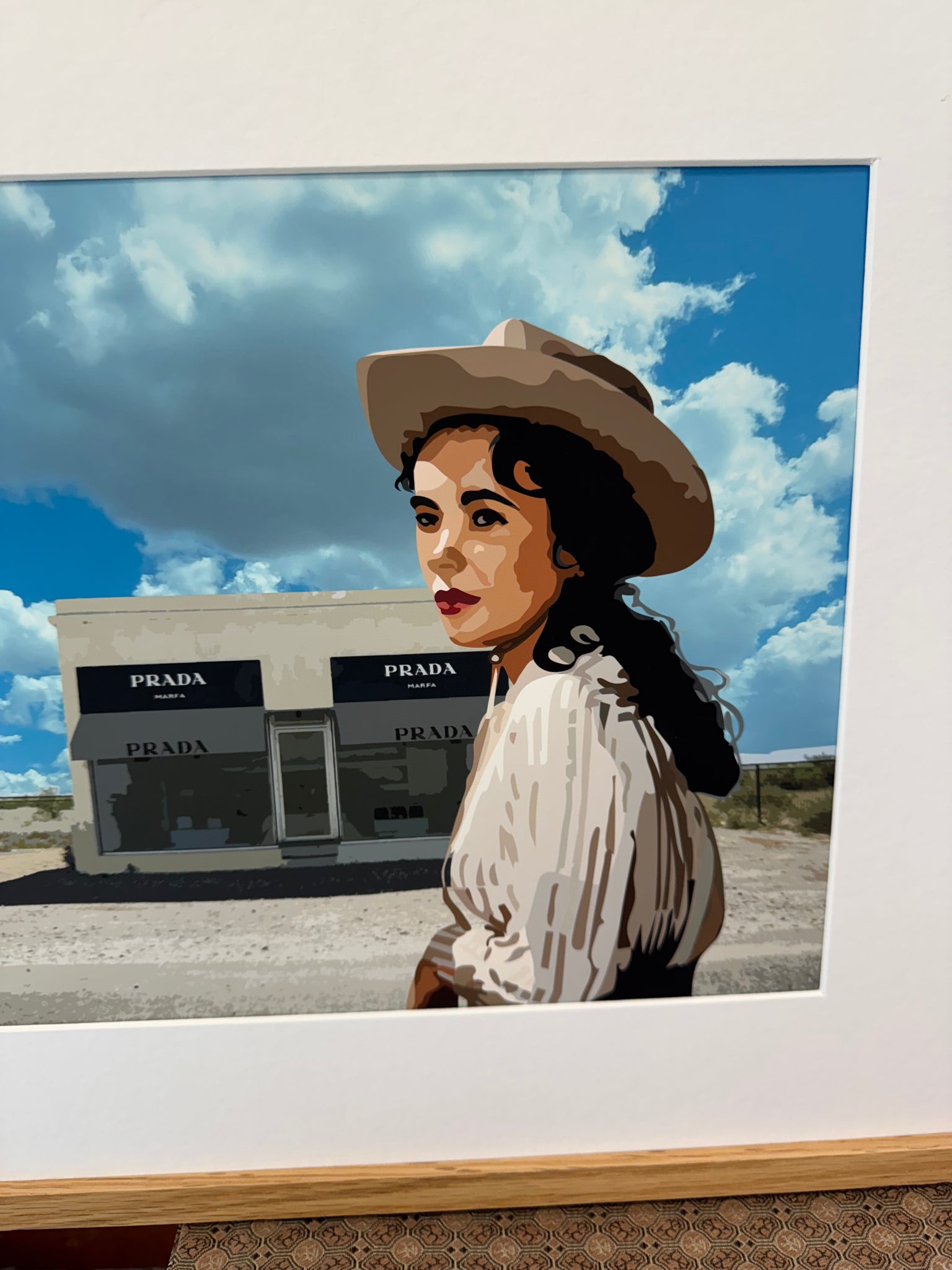 Celebrate iconic glam with "Liz and Prada," a playful oil paint-by-number reproduction spotlighting Elizabeth Taylor alongside the quirky Prada Marfa installation in Texas. This vibrant piece comes beautifully matted and framed, making it a fun and stylish addition to any art lover’s collection or a quirky conversation starter in your home. Bring a touch of celebrity charm and desert whimsy to your walls effortlessly!