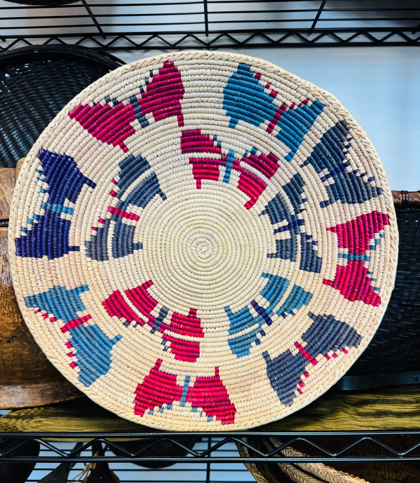 This handwoven tribal basket features a vibrant red and blue design, adding a touch of tradition and color to your space. Crafted with care, it’s perfect for organizing small items while bringing a unique, cultural charm to your home. Its sturdy weave ensures durability, making it both a practical and beautiful addition to your decor.