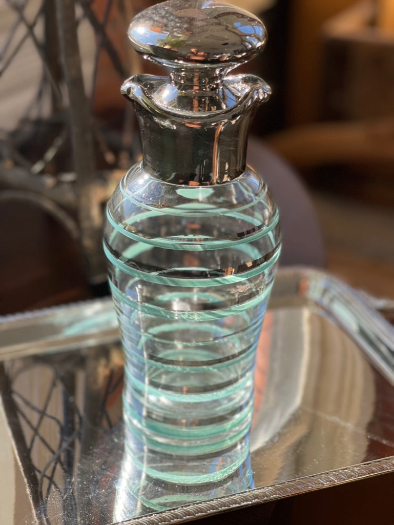 This fun 1950's retro design cocktail shaker, has a double pour feature and silver plate and crystal stopper. The blue and silver double painted stripe makes this shaker so unique.