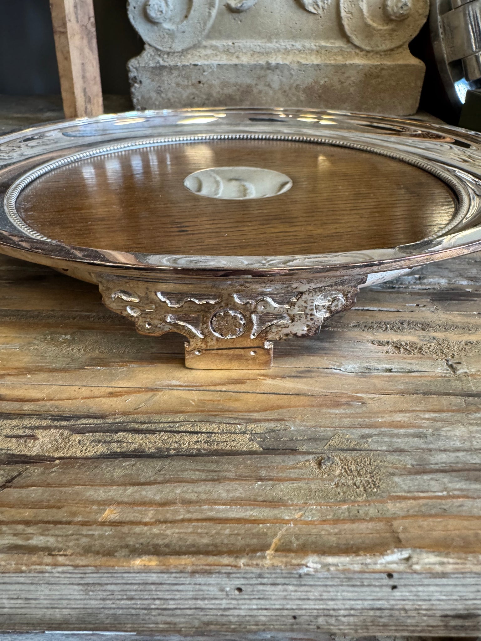 Oak & Silver Round Tray with Ornate Feet