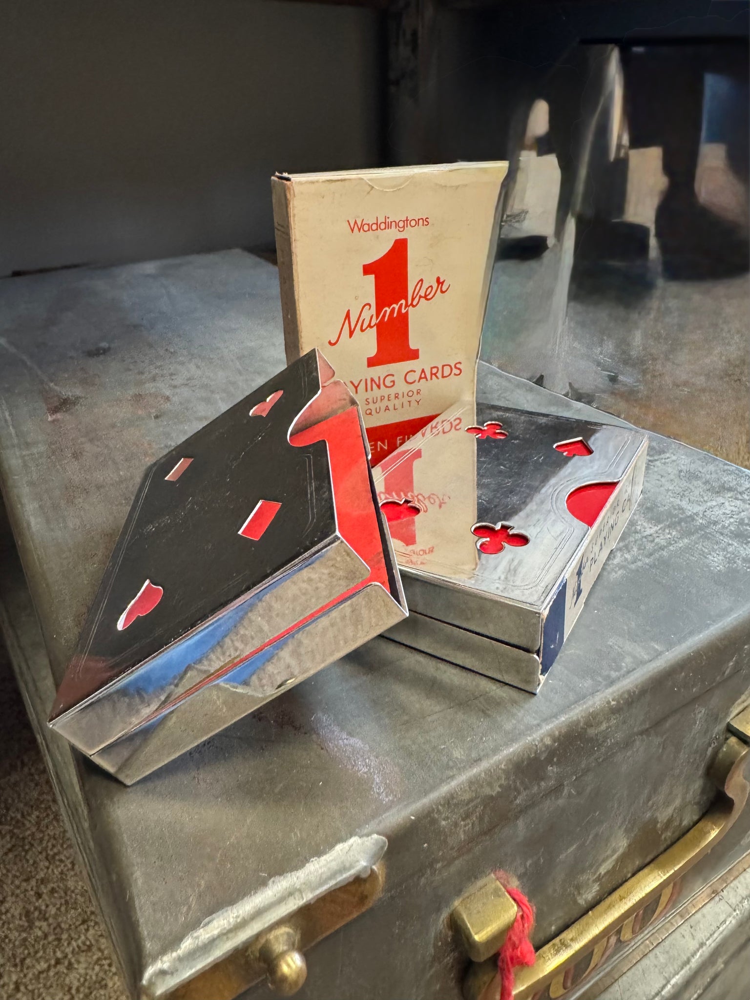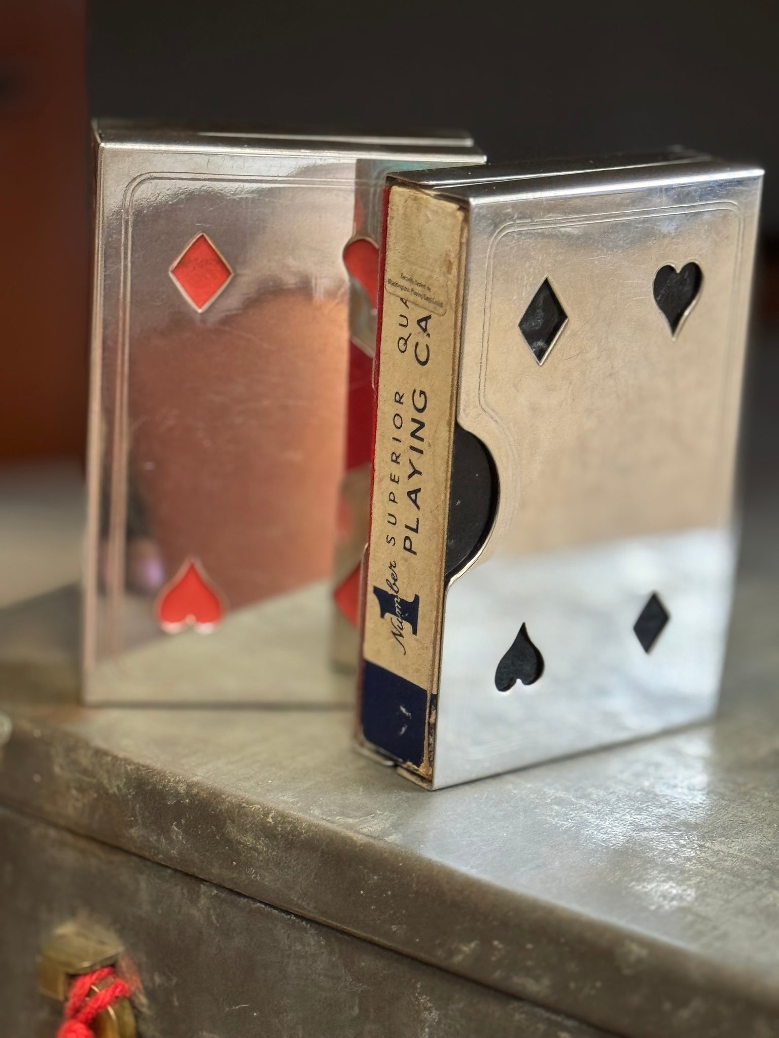Shuffle up and deal with this vintage silver-plated playing card box from London, England. Elegantly crafted, it holds a full set of cards ready for your next round of fun. Perfect for collectors or anyone who loves a little history mixed with their cards!